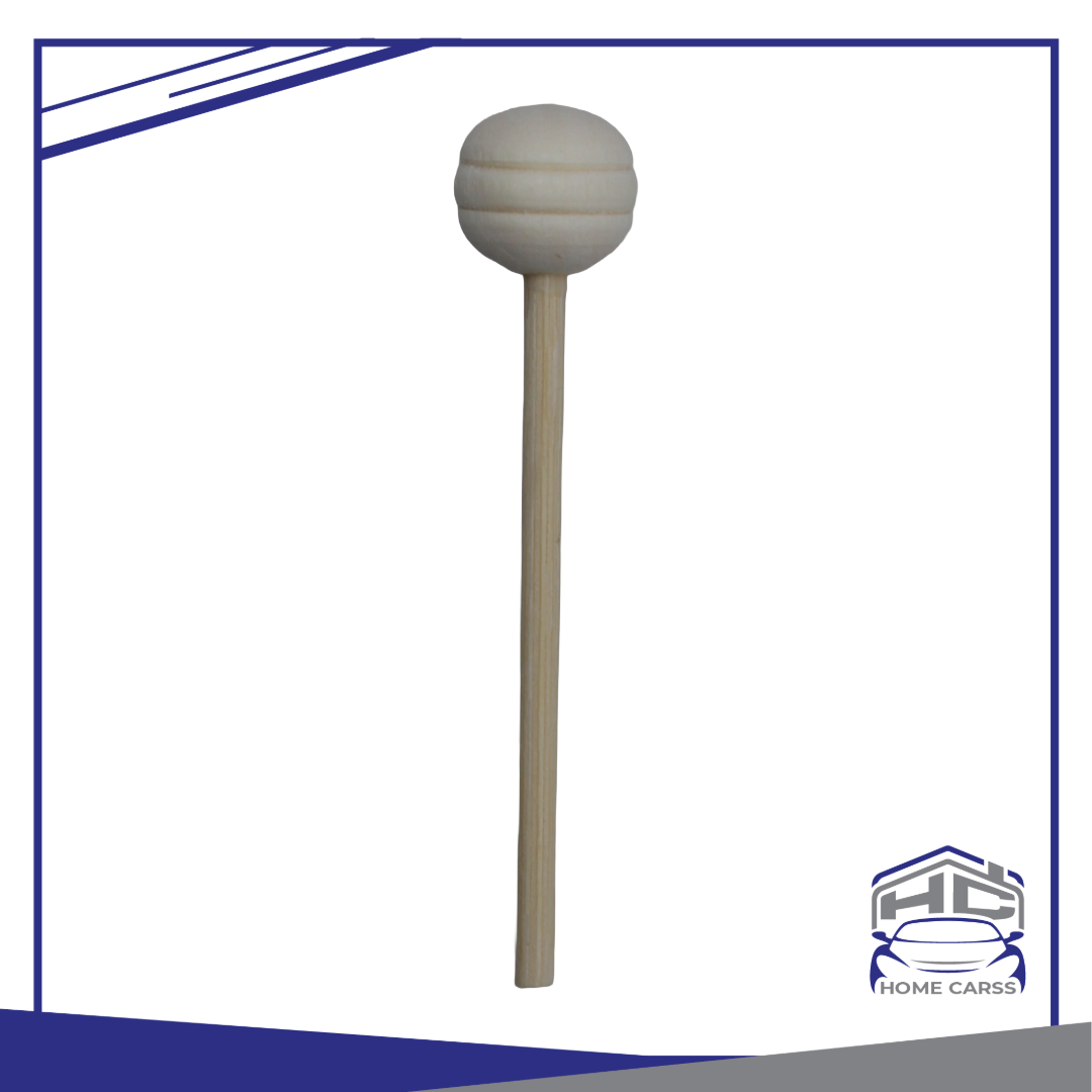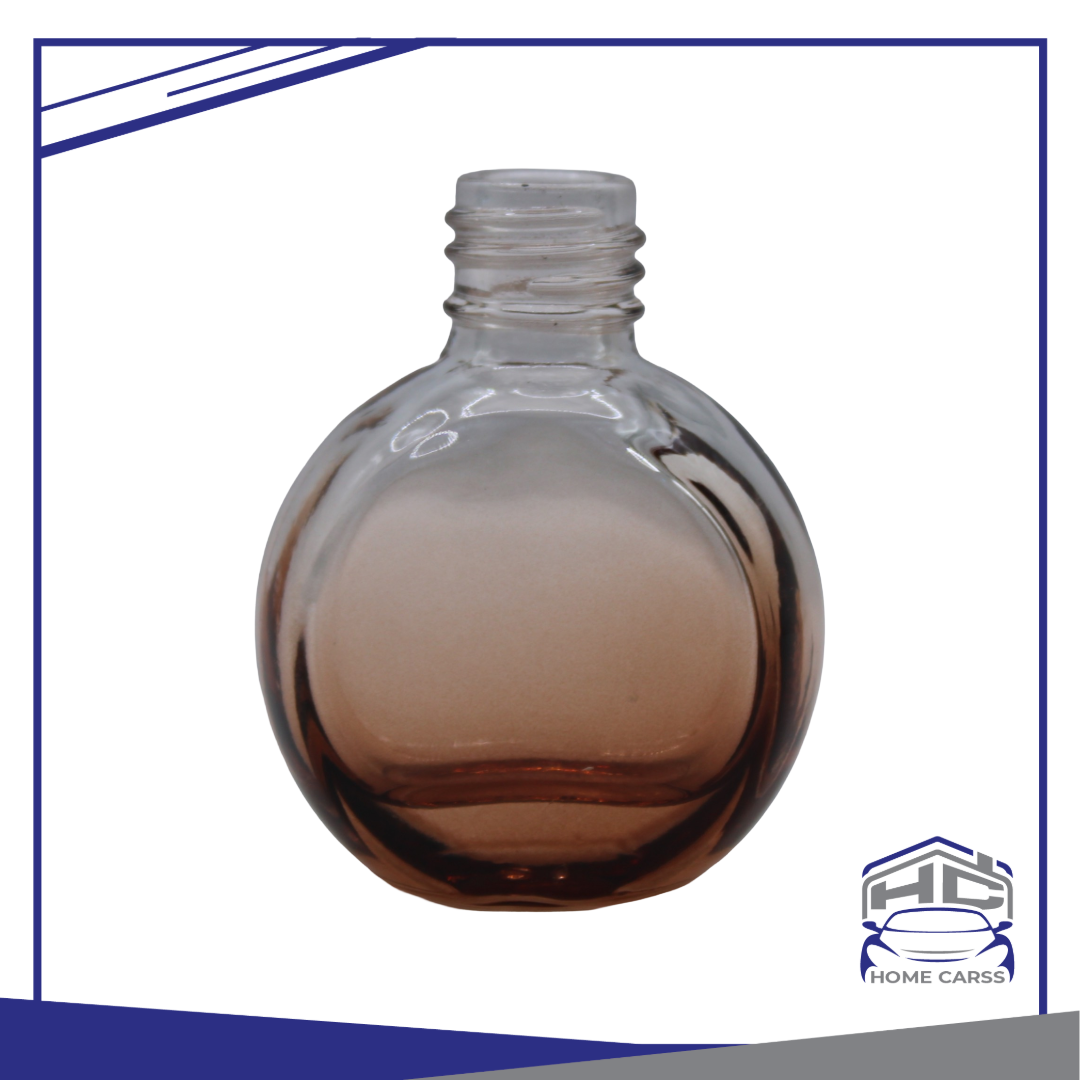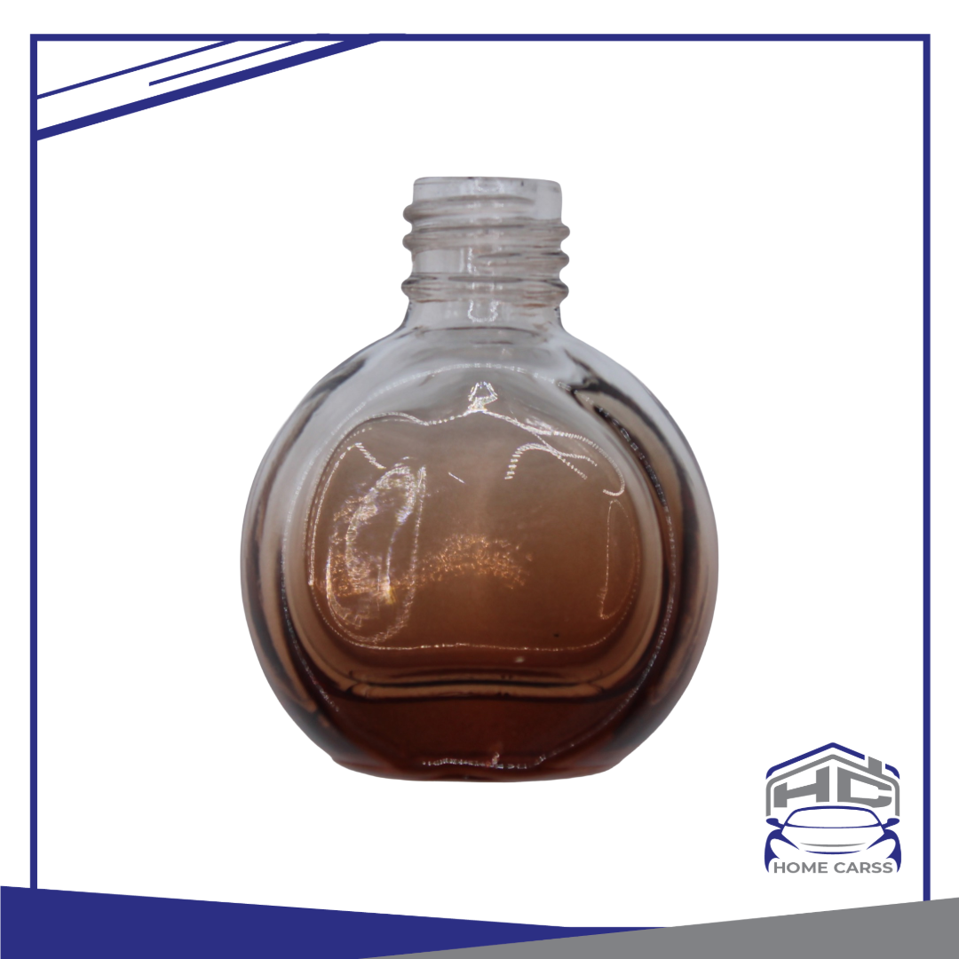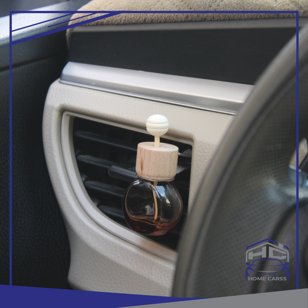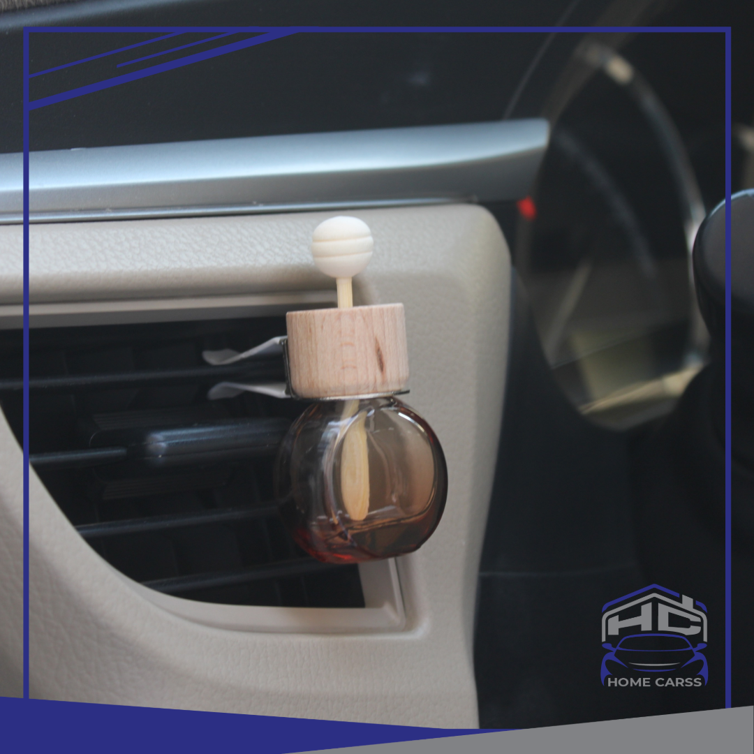 زجاجة صغيرة شفافة ذات لون بني فاتح مع غطاء خشبي دائري ومقبض خشبي صغير في الأعلى. يحتوي على مشبك معدني أبيض لتثبيته على فتحات مكيف الهواء، مما يسمح بانتشار العطر في جميع أنحاء السيارة.