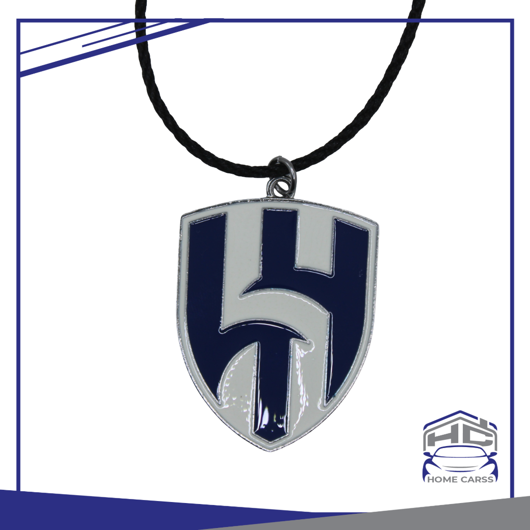 قلادة معدنية بتصميم شعار نادي الهلال السعودي لكرة القدم. الشعار على شكل درع، ويتميز بتصميم الحرفين "H" و "L" باللون الأزرق والأبيض اللامع. القلادة معلقة بسلسلة حبل سوداء، مما يجعلها إكسسوارًا أنيقًا وبسيطًا لمشجعي نادي الهلال.