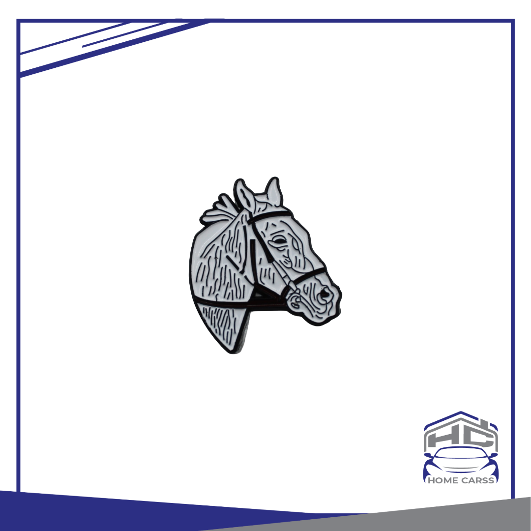 بتصميم رأس حصان أنيق، باللونين الأبيض والأسود. يبرز التصميم الخطوط التفصيلية التي توضح ملامح الحصان، بما في ذلك اللجام.