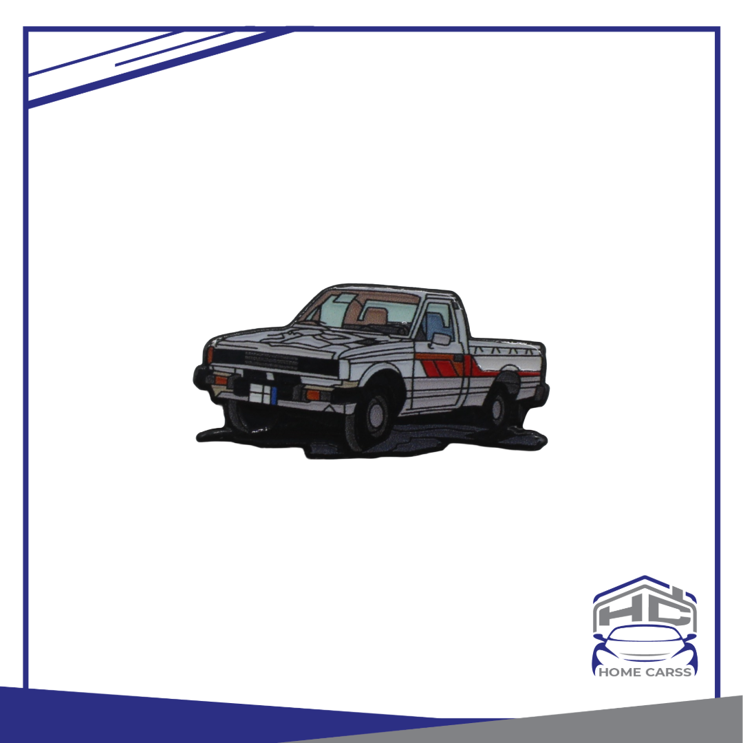 بتصميم سيارة بيك آب (ددسن) كلاسيكية، باللون الأبيض مع خطوط حمراء وبيضاء على الجانب. يبرز التصميم تفاصيل السيارة بأسلوب فني، بما في ذلك المصابيح الأمامية، الشبكة، والعجلات.