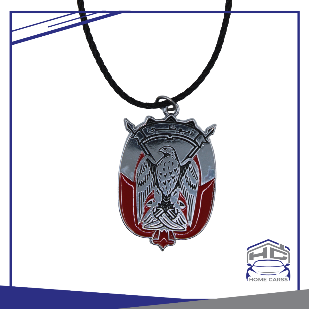 قلادة معدنية بتصميم شعار دولة الإمارات العربية المتحدة (صقر الإمارات). تتميز بتصميم بيضاوي باللونين الأحمر والفضي، ويتوسطها صقر يحمل درعًا عليه علم الإمارات، محاطًا بكتابة عربية. القلادة معلقة بسلسلة حبل سوداء، مما يجعلها قطعة تذكارية أو رمزًا وطنيًا مميزًا.