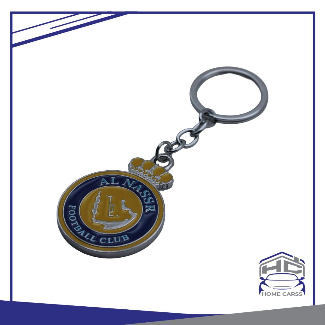 ميدالية مفاتيح معدنية بتصميم شعار نادي النصر السعودي لكرة القدم. الشعار دائري الشكل يعلوه تاج، ويتميز باللونين الأصفر والأزرق الداكن مع تفاصيل خريطة شبه الجزيرة العربية. مكتوب عليه "ALNASSR FOOTBALL CLUB". متصلة بحلقة مفاتيح وسلسلة معدنية فضية، مما يجعلها إكسسوارًا مميزًا لمشجعي النادي.